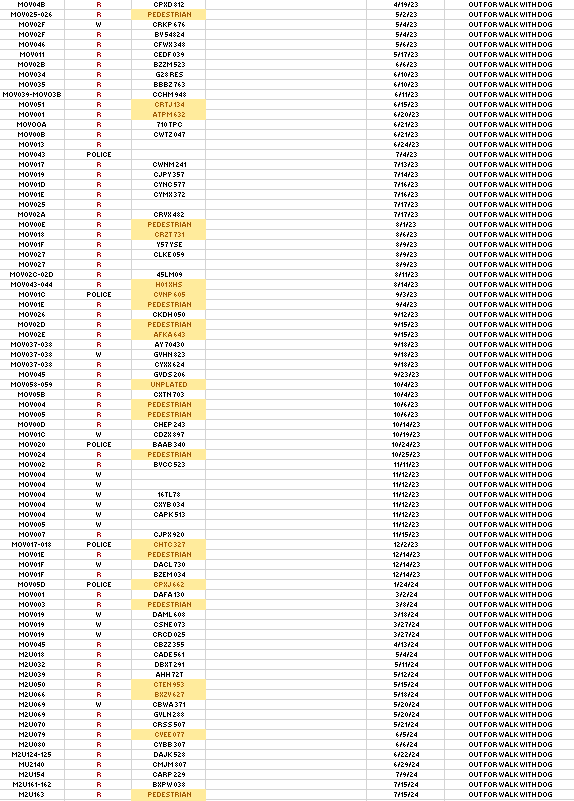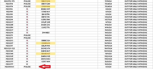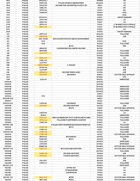 SPREADSHEETS DOCUMENTING 6 YEARS OF UNCONSTITUTIONAL "RED" STALKING AND HARASSMENT AT THIS SPECIFIC GEO-LOCATION